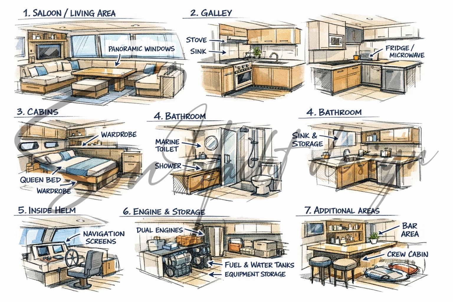 Nội thất công năng của một chiếc catamaran (tàu hai thân) được thiết kế nhằm tối ưu không gian – cân bằng – tiện nghi – an toàn, thường chia theo khu vực chức năng như sau: