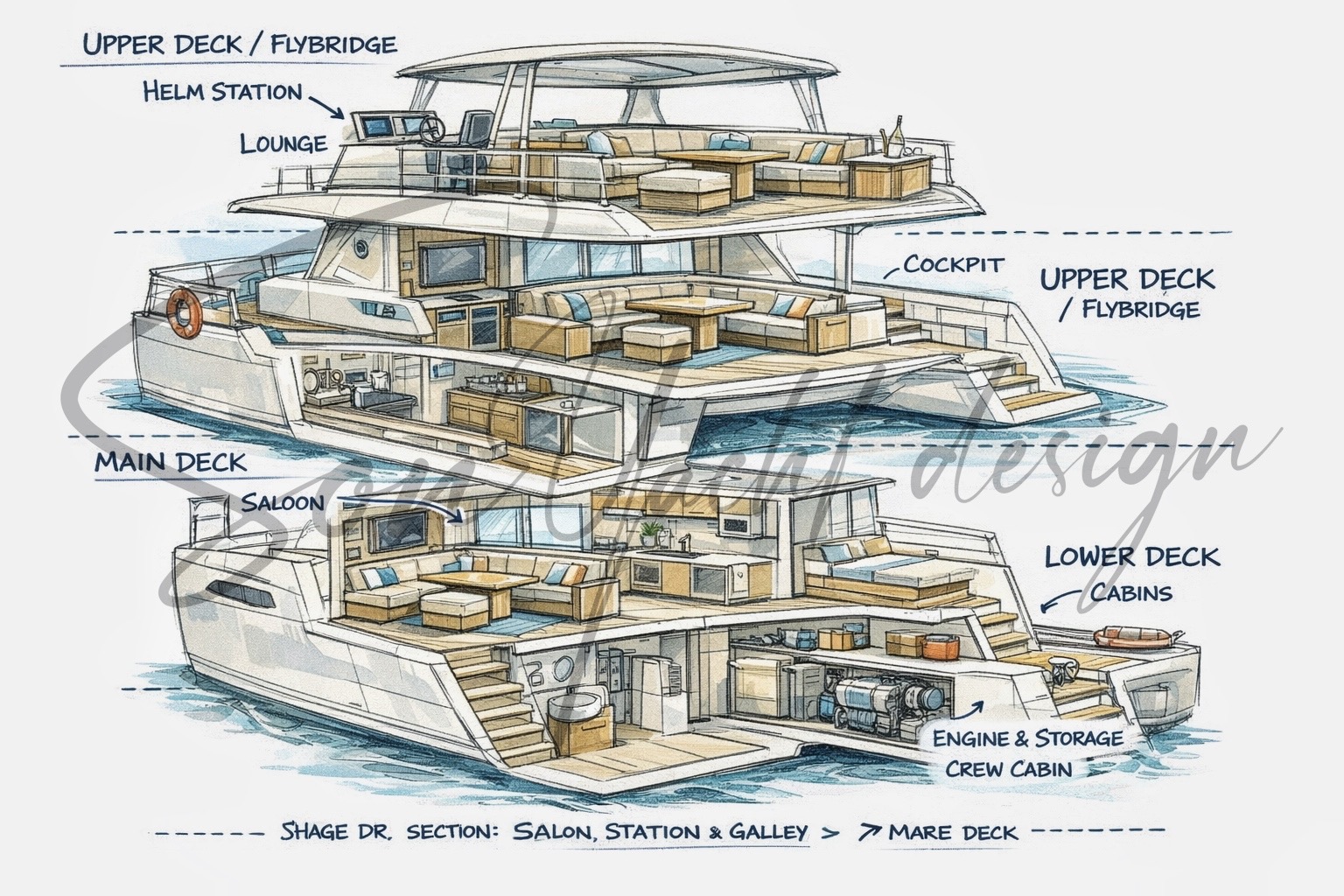 - Catamaran 45–60 ft: cấu hình 3 tầng tiêu chuẩn